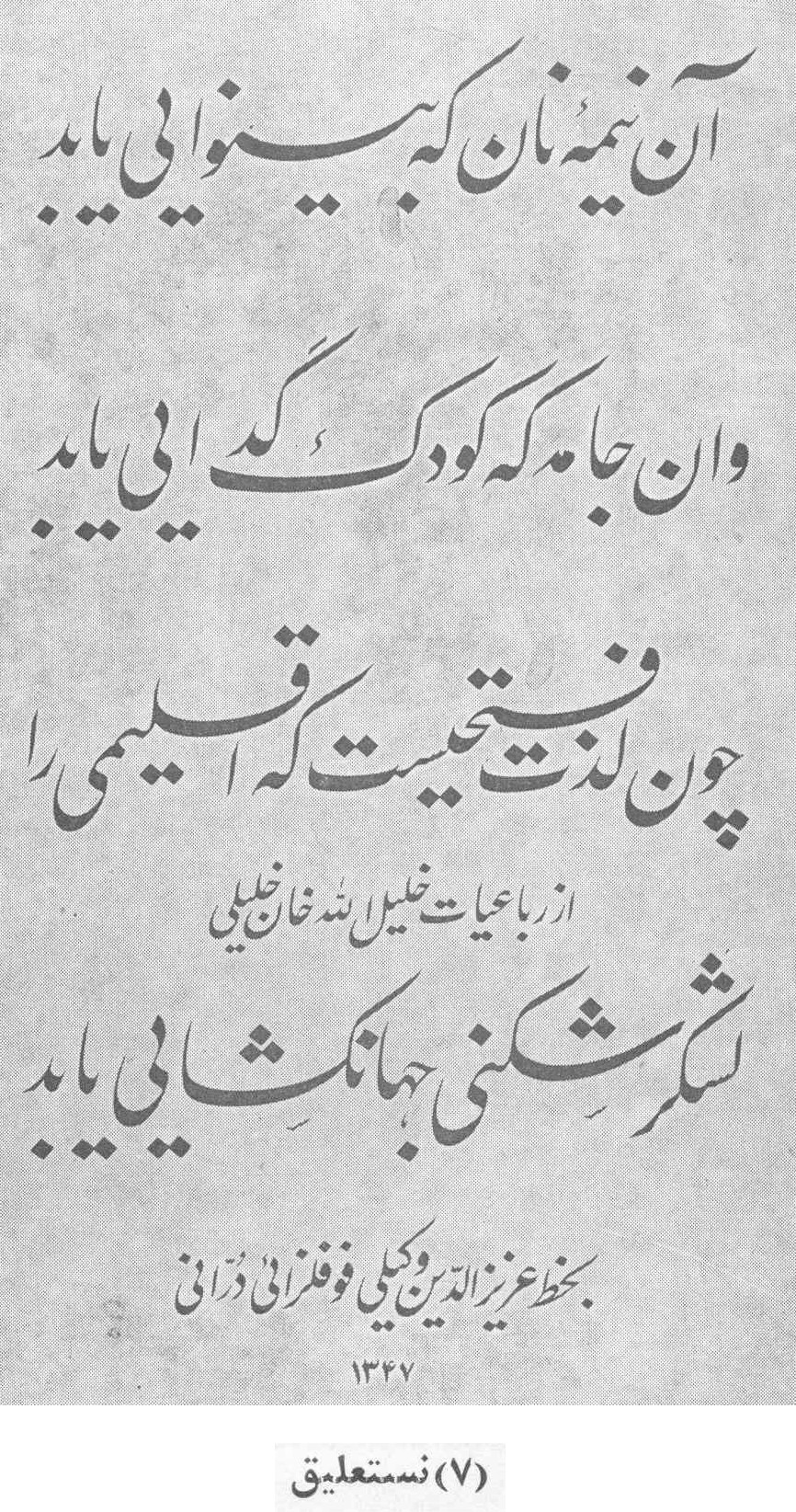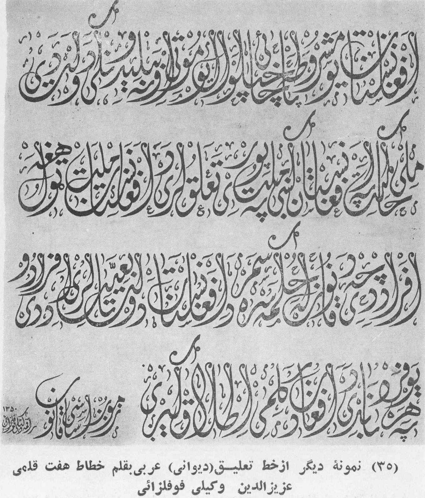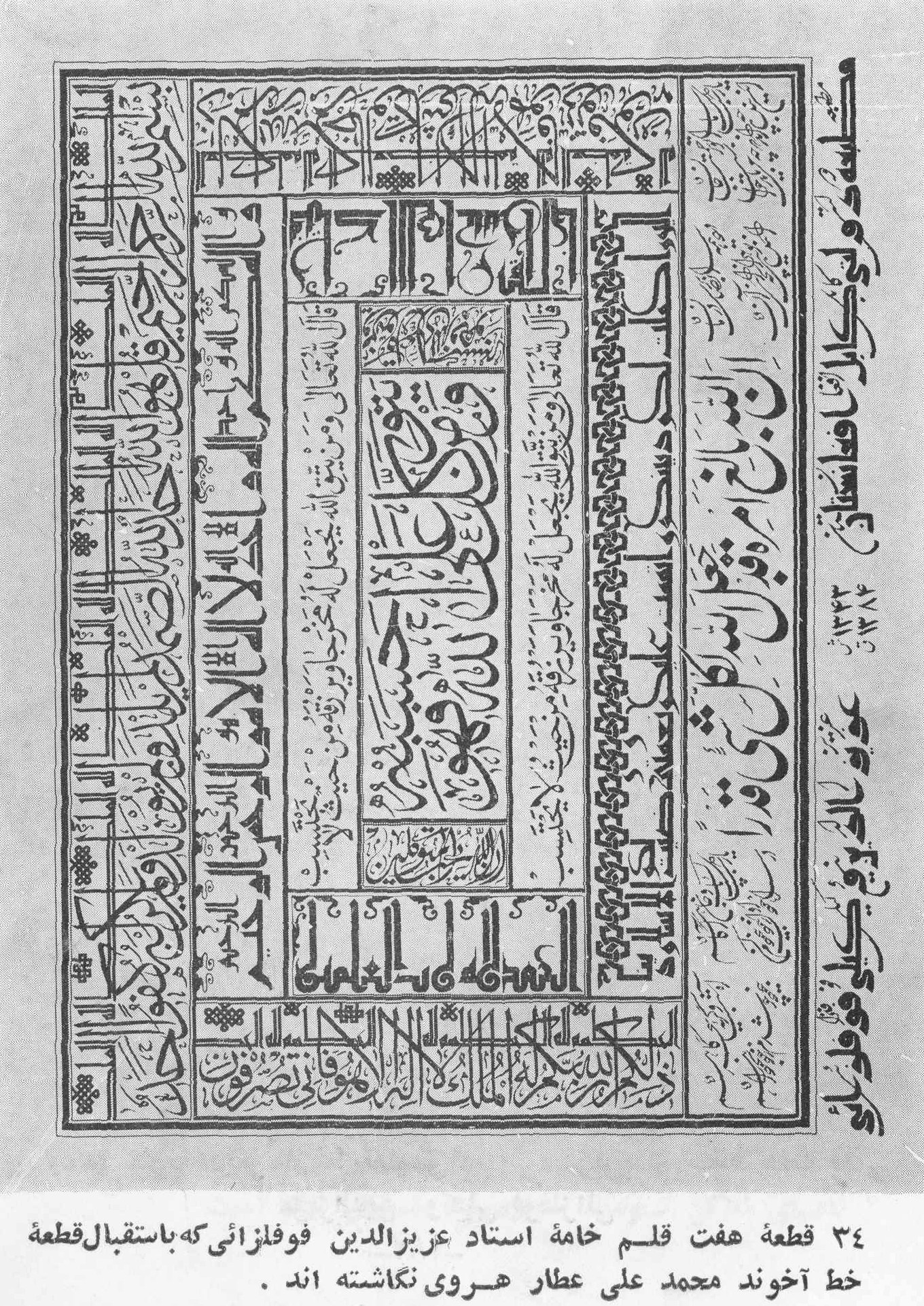 « اکنون که داستان آفرینش خط را در افغانستان شنیدید و نمونه های تاریخی را هم دیدید، ما خوانندگان گرامی خود را به تماشای پدیدۀ هنری خط در عصر حاضر می آوریم. مواریث هنری گذشتگان ما درین عصر نیز خوشبختانه زنده اند، و ممثل بزرگ این هنر درین وقت استاد قادرالقلم عزیزالدین وکیلی فوفلزائی قندهاری ولد مرحوم جاجی نظام الدین خان ساکن کابل اند، که با وجود داشتن مرتبۀ اولین در صف خوشنویسان این زمان، نویسندۀ مؤرخ و شاعر نیز میباشند.