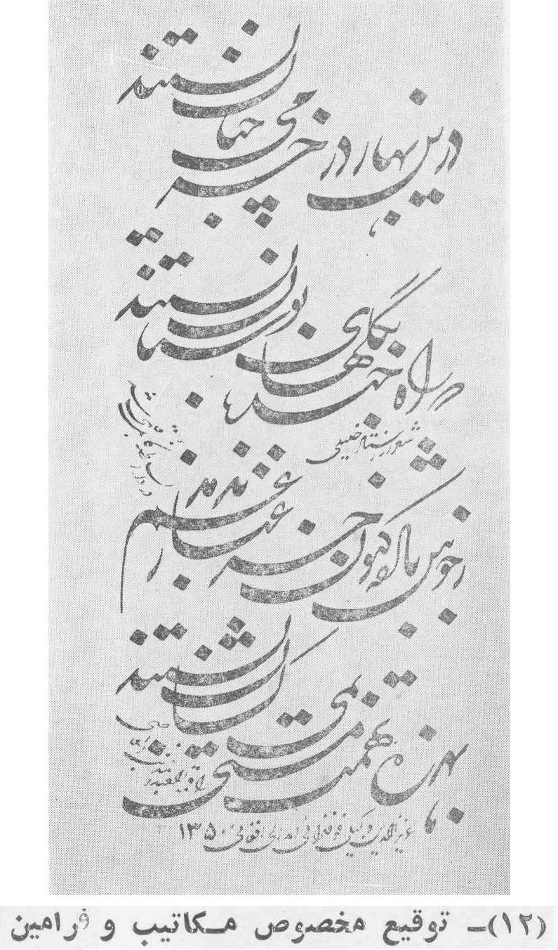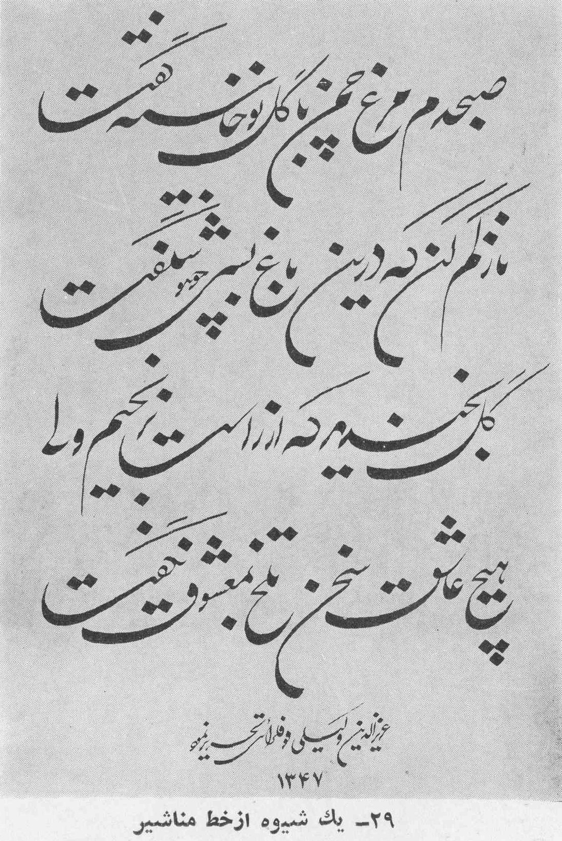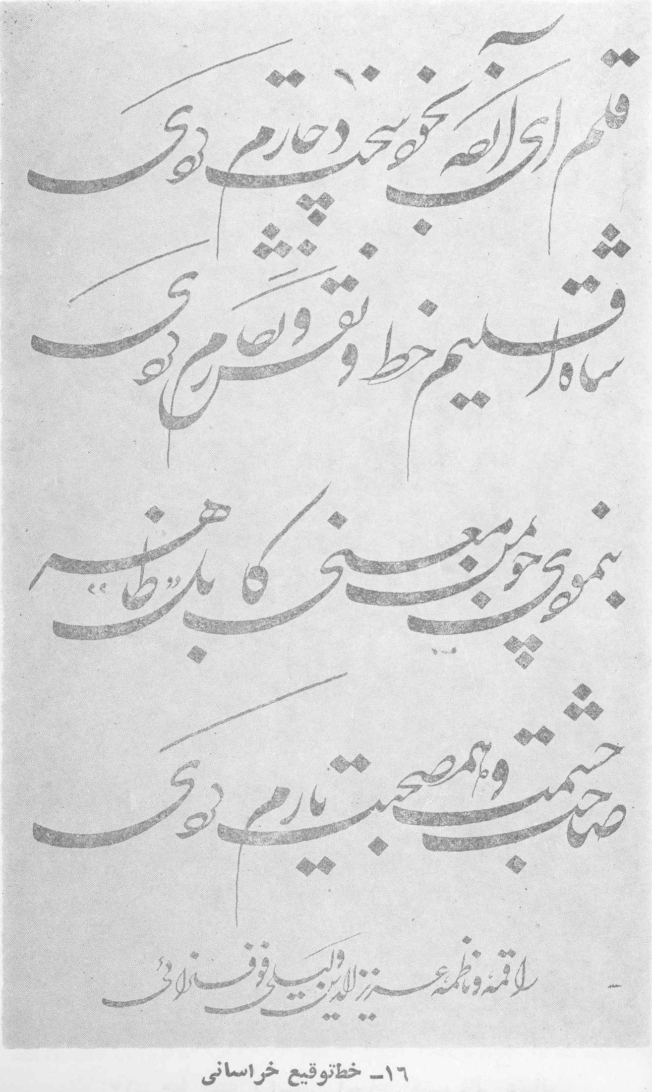 « اکنون که داستان آفرینش خط را در افغانستان شنیدید و نمونه های تاریخی را هم دیدید، ما خوانندگان گرامی خود را به تماشای پدیدۀ هنری خط در عصر حاضر می آوریم. مواریث هنری گذشتگان ما درین عصر نیز خوشبختانه زنده اند، و ممثل بزرگ این هنر درین وقت استاد قادرالقلم عزیزالدین وکیلی فوفلزائی قندهاری ولد مرحوم جاجی نظام الدین خان ساکن کابل اند، که با وجود داشتن مرتبۀ اولین در صف خوشنویسان این زمان، نویسندۀ مؤرخ و شاعر نیز میباشند.